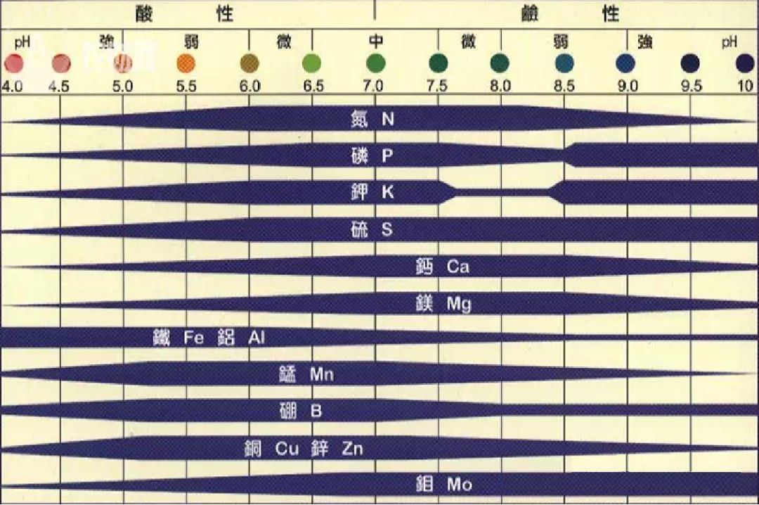 这张图充分说明土壤不同PH值对各营养元素有效性的影响。有时我们看到树上表现出缺素症有现象,但土壤补充后,却见不到效果,主因就是因为土壤PH值过酸或过碱,导致我们施下去的营养元素有效性差,没办法被柑橘吸收利用。